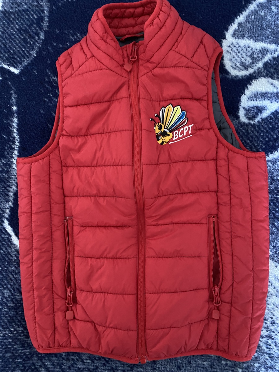Doudoune rouge avec logo du club brodé.