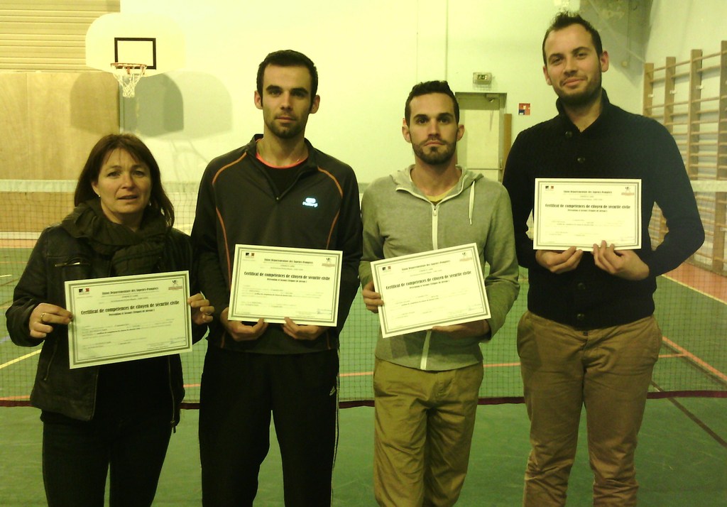 Les diplômes ont été remis à Mme PLUMEJEAU Sophie, Messieurs DEBIAIS Brice, FORTIER Christophe et LEFEUVRE Romain, en présence de l’Adjudant ROUSSINEAU Jean-Claude responsable du CPI et d’Eric Gentil Vice Président de l’USR Badminton qui précise qu’une autre formation aux gestes de premiers secours est prévue par le club au cours du premier trimestre 2015.